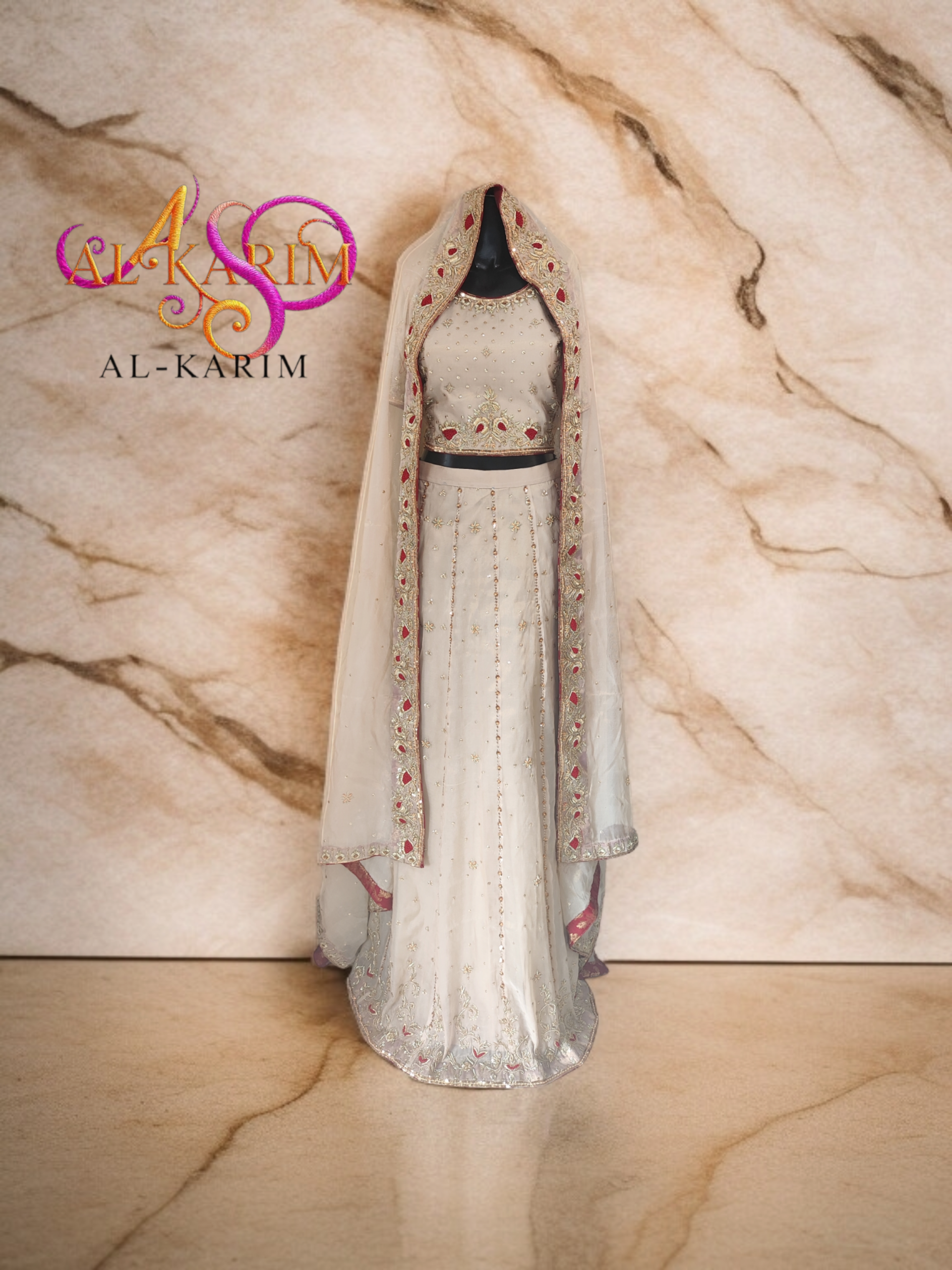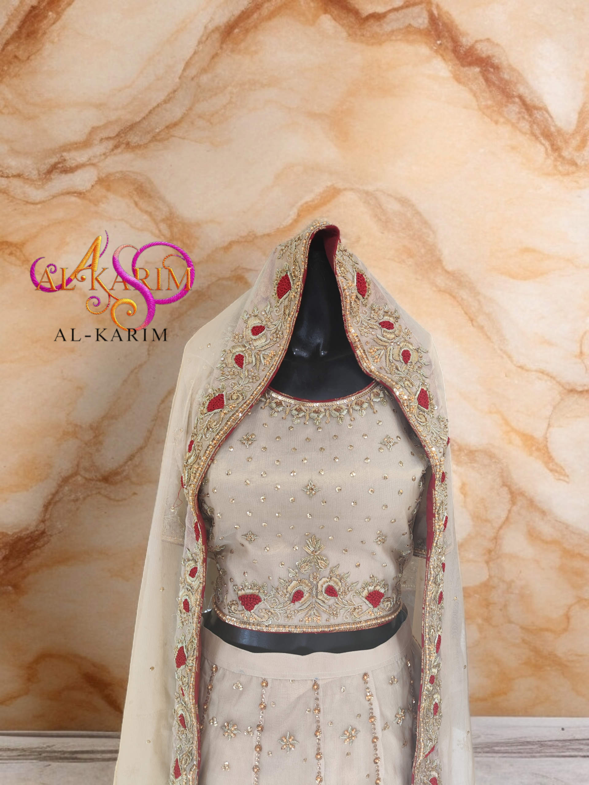 An ivory masterpiece kissed with ruby and gold — this bridal ensemble from Al-Karim Silk blends tradition with timeless luxury.