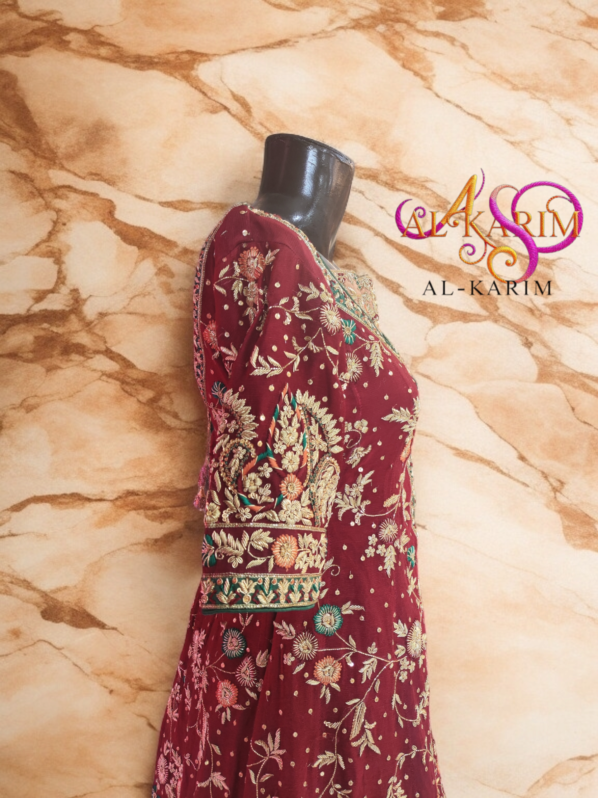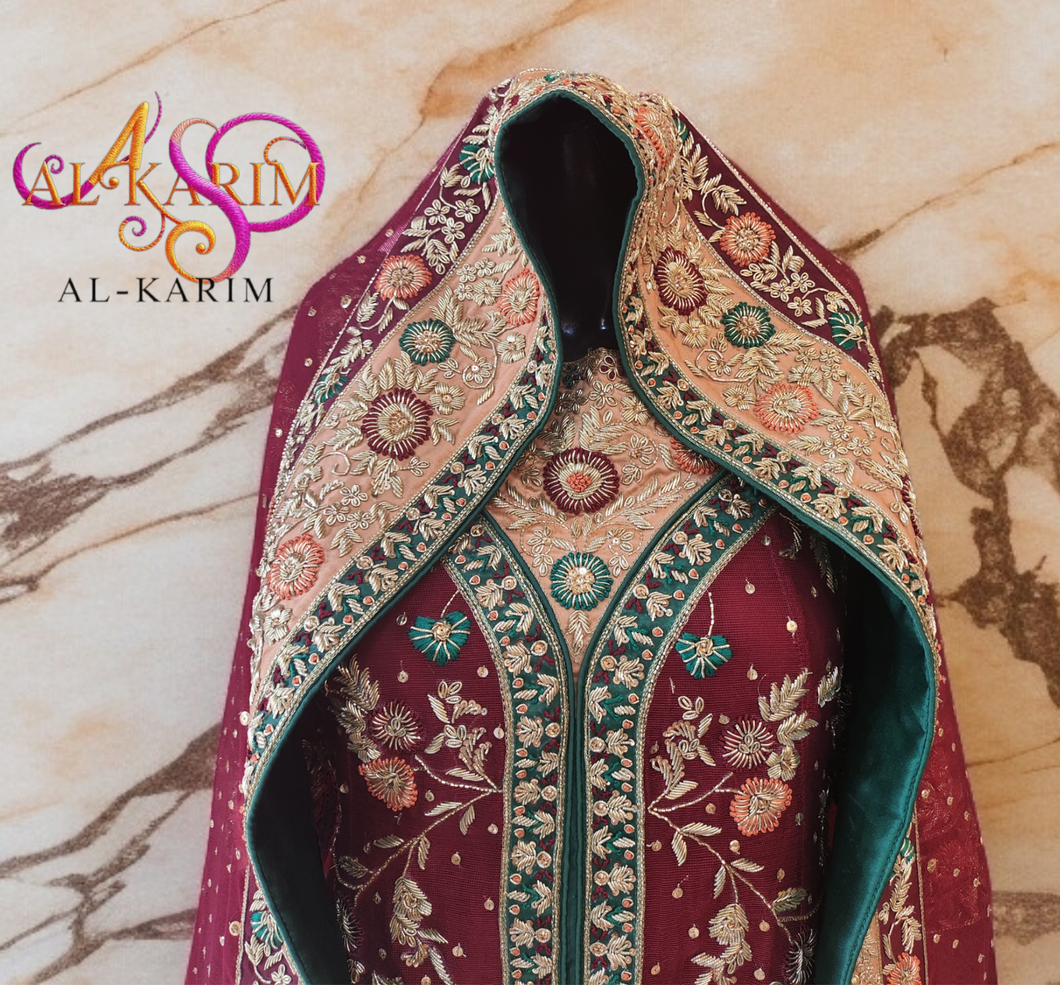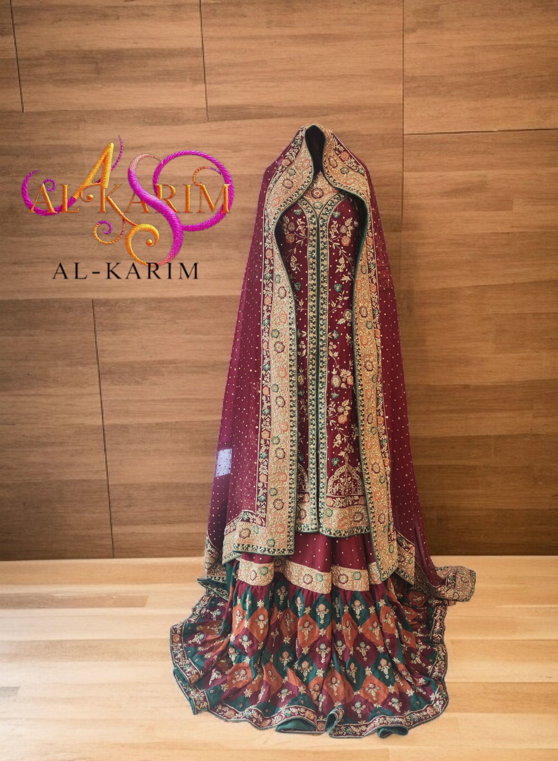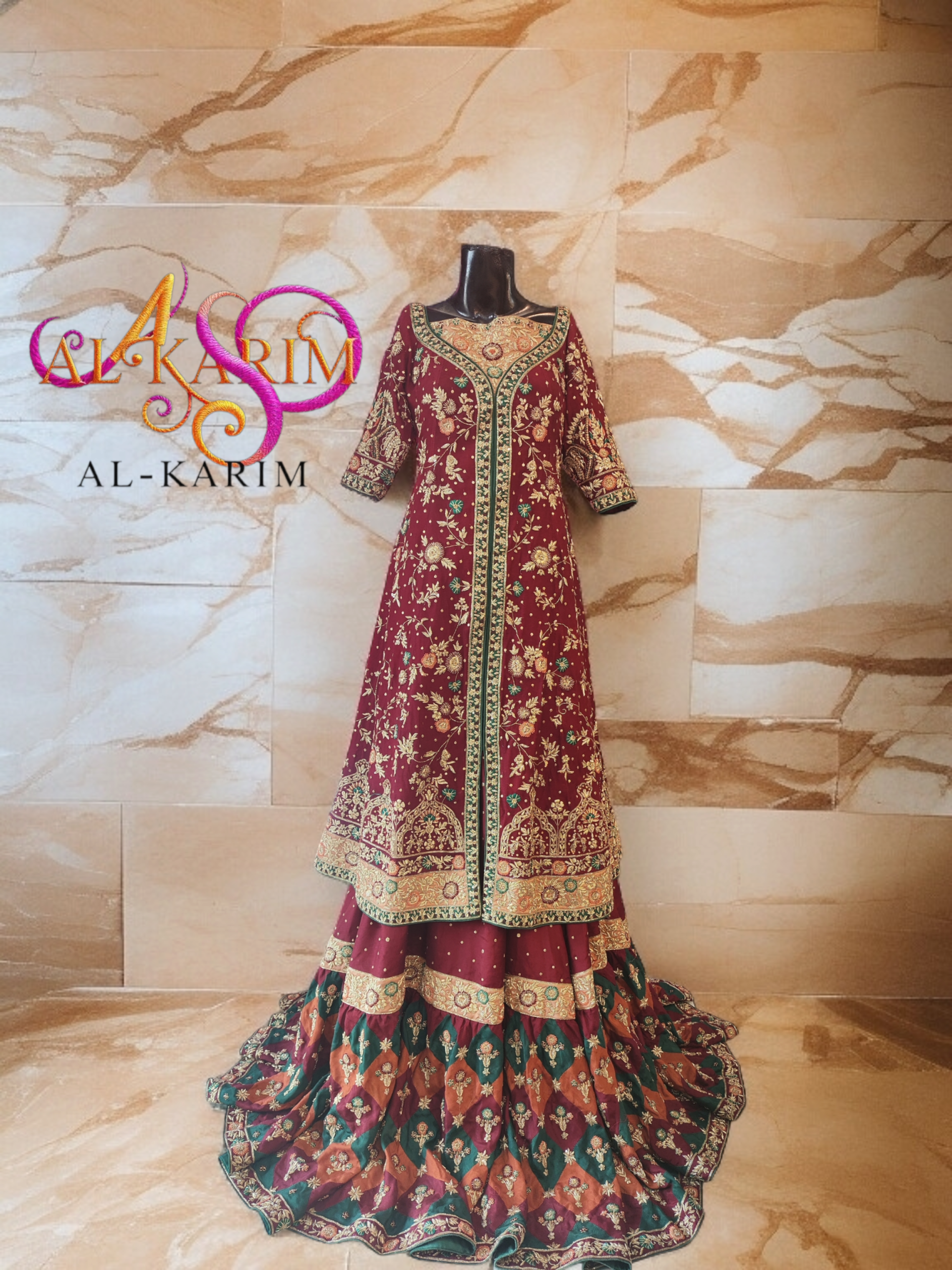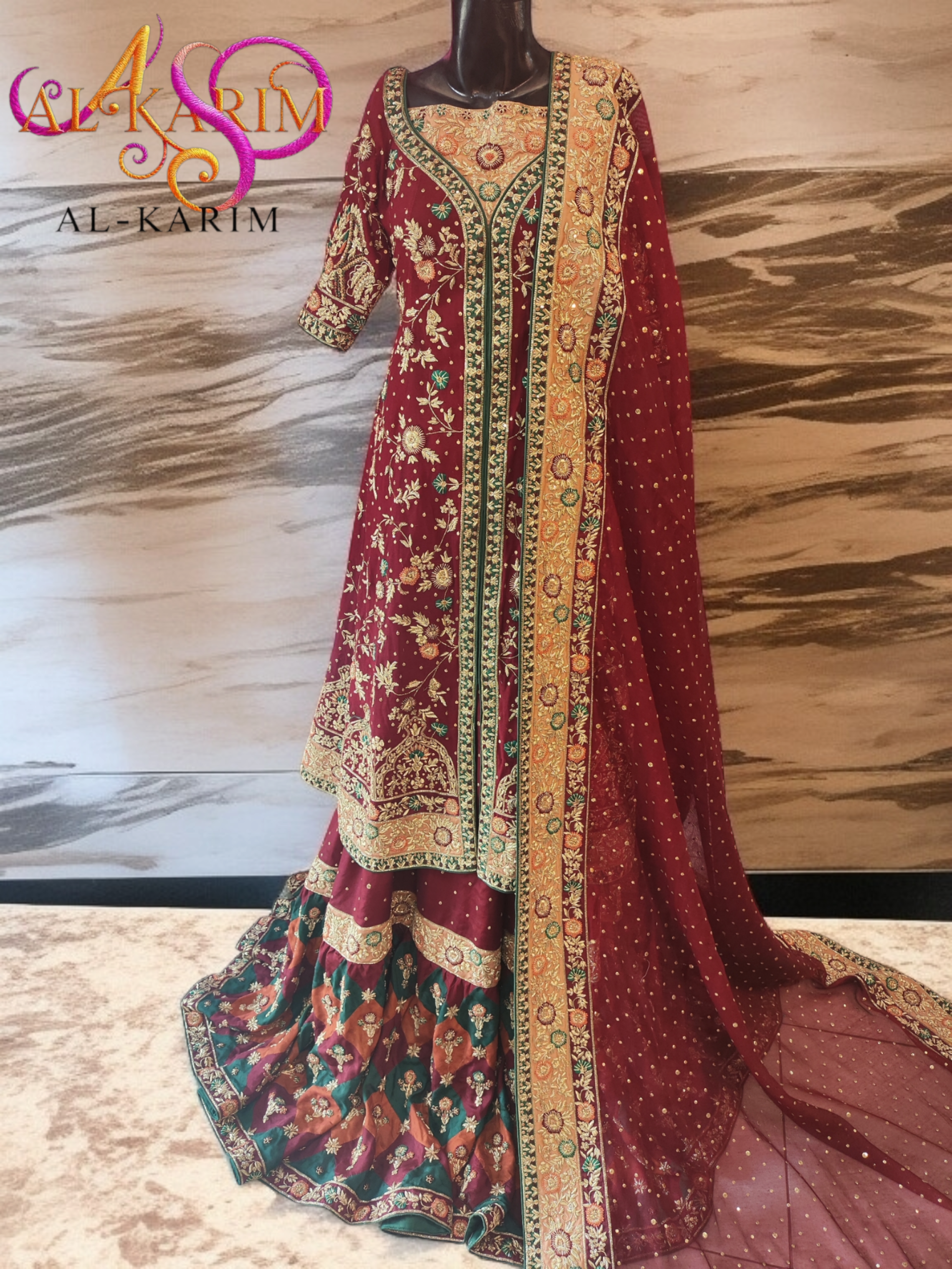 A majestic symphony of maroon, emerald, and antique gold β€” hand-embroidered to perfection for the woman who embodies heritage and high fashion.