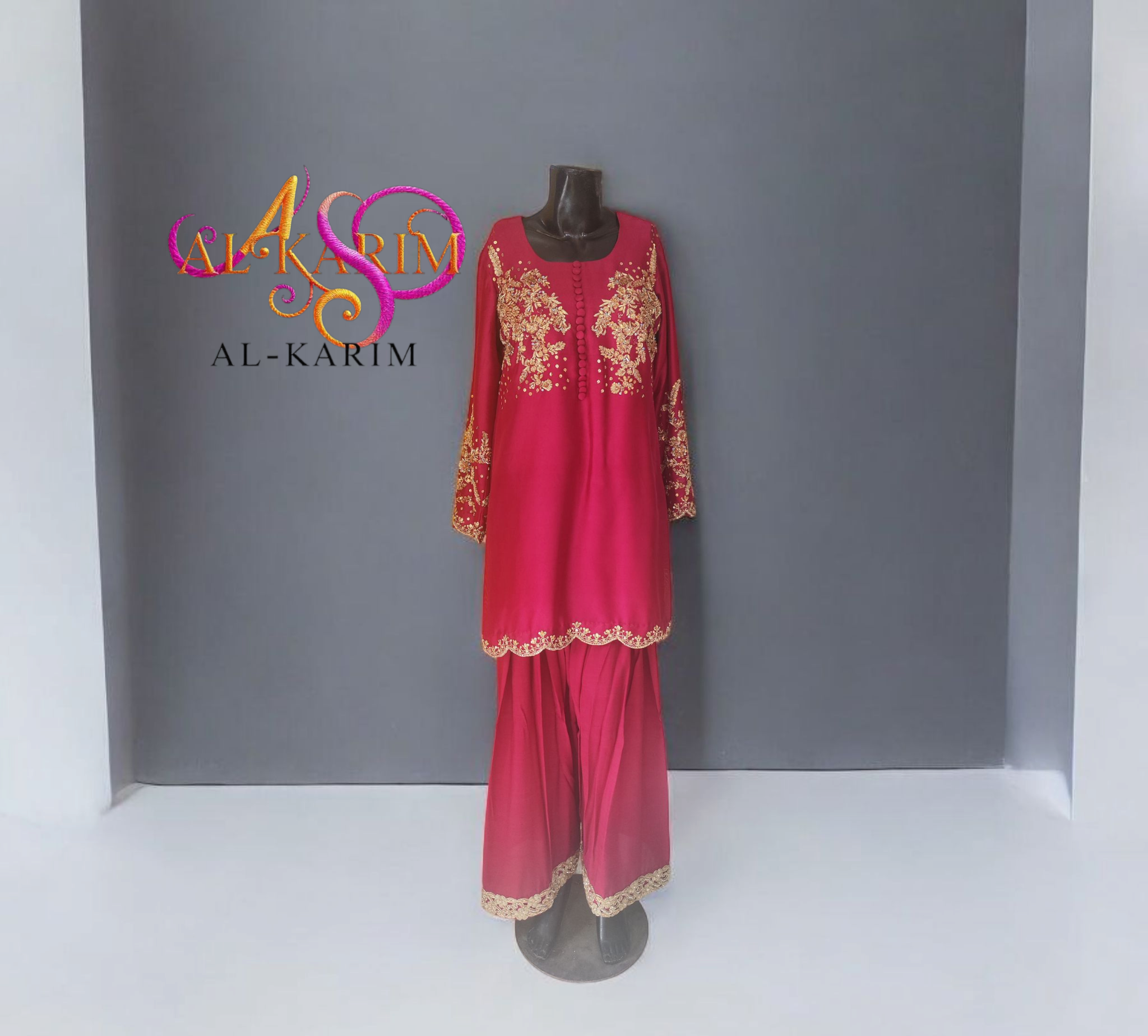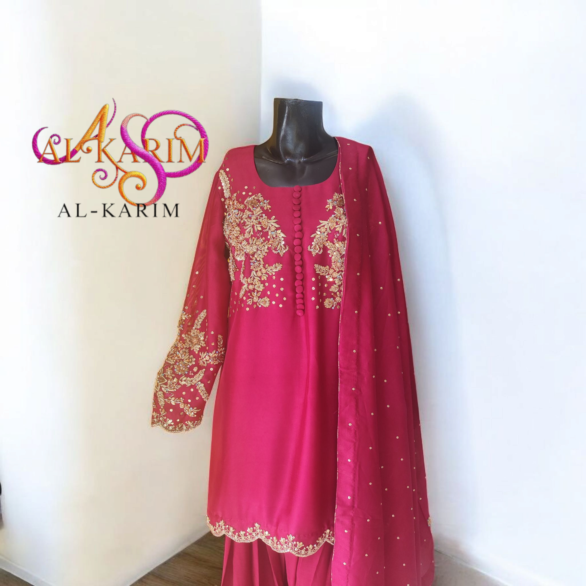 Wrapped in rich magenta and adorned with delicate golden embroidery, this timeless outfit is a tribute to femininity and finesse.